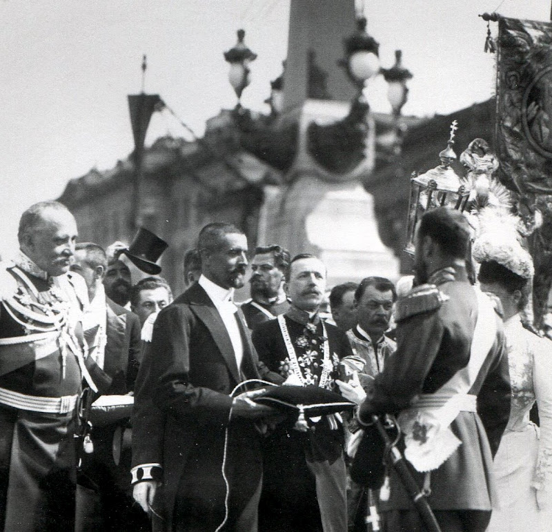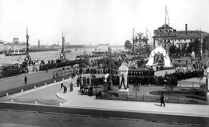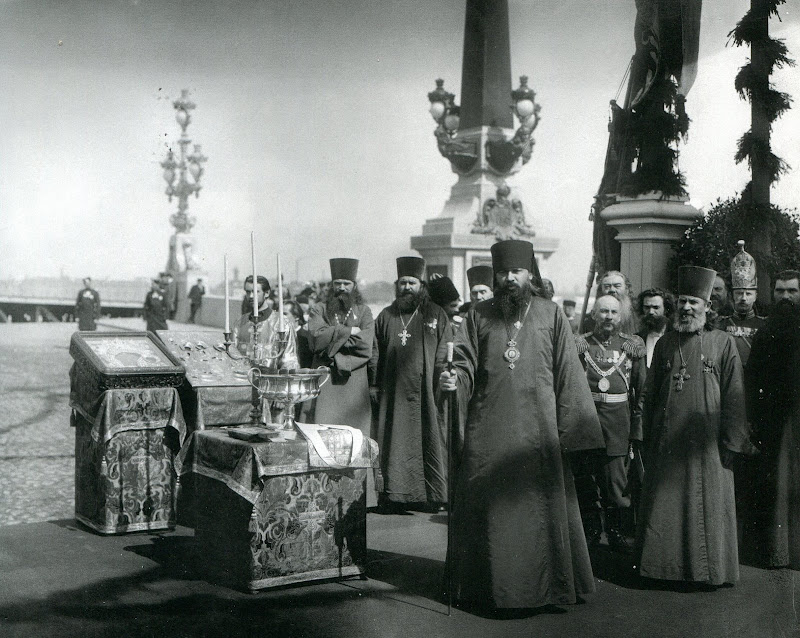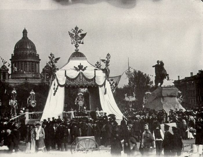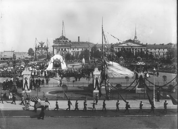 К 11-ти на красиво разубранной местами для публики, мачтами и флагами Суворовской площади, к устроенному посредине шатру, собрались высшие чины: ждали Их Величеств к открытию нового Троицкого моста, который был еще разведен. Прибыла вдовствующая Императрица с Наследником, а за ними Царь с Царицей. Перед иконой Казанской Божией Матери викарный архиерей отслужил молебен с водосвятием.