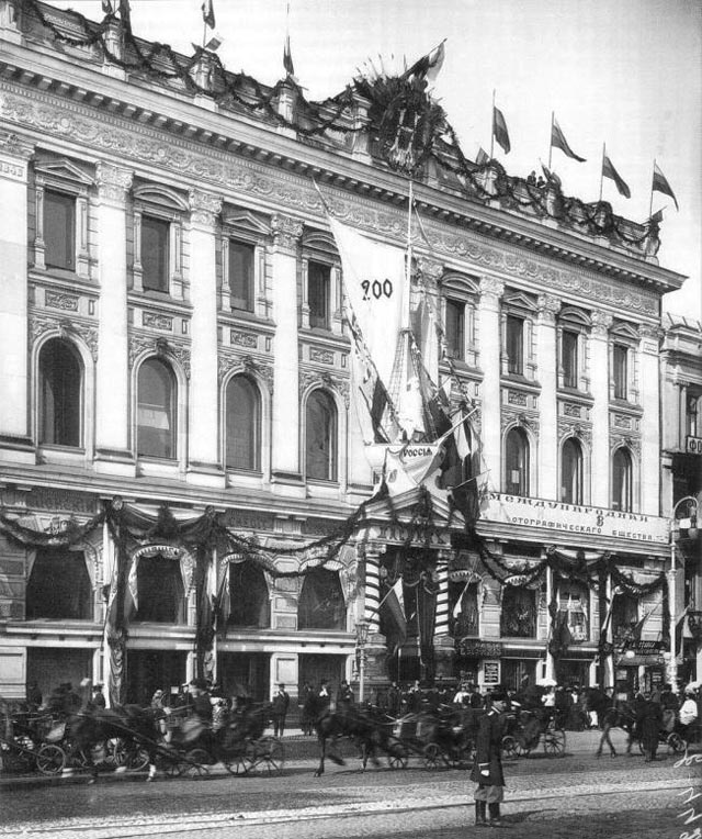 Долго строящийся дом, на углу Невского и Екатерининской, покрылся к юбилею красной деревянной крышей и навесил на себя множество маленьких флагов. Улицы переполнены торговцами, выкрикивающими достоинства своих жетонов, флагов, книжек, кусков полотна с изображением видов Петербурга и продающими «доброе слово Государя к русскому народу». Раздаются возгласы на разный лад, даже такие: «десять копеек жетон, десять копеек жетон!», будто бы покупатели не верят, что так дешево, или «флаги копейка, флаги копейка». В 12¼ ч. мы вернулись домой. В 12½ ч. в Исаакиевской церкви вдруг загудел колокол, и загремели пушки одна за другой.