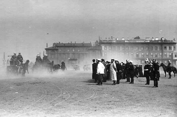 Старые Петровские знамена стояли вокруг помоста. Войска были выстроены по набережной и вдоль Сената до Исаакия. Солнце жгло немилосердно, потому что мы стояли без навеса. После молебна только вошли в шатер, из кот. довольно плохо слышали кантату, исполненную военными певчими. Затем войска прошли церемон. маршем, и мы уехали в Зимний. У нас происходил фамильный завтрак.