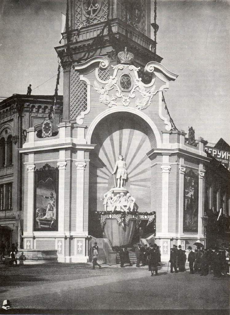 — Утро чудесное! Пошел по Невскому пр. пешком к собору Исаакия. Пестреют флаги и драпировки, магазины закрыты. Против Невского у Николаевского вокзала стоит арка с тремя картинами: средняя изображает бурю на море и Петра, спасающего тонущих; левая — вид Петербурга, правая — вид Невы до основания города. Народ лился по обеим сторонам густой и спокойной волной; много было простонародья, все приодеты, чистенькие, трезвые: винные лавки были закрыты еще накануне.