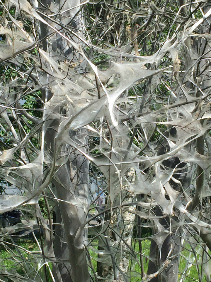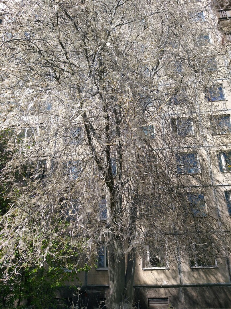 Жители южных районов Петербурга сообщают, что гусеницы уничтожают листву на деревьях сразу в нескольких городских скверах. Пораженные деревья полностью покрыты паутиной.