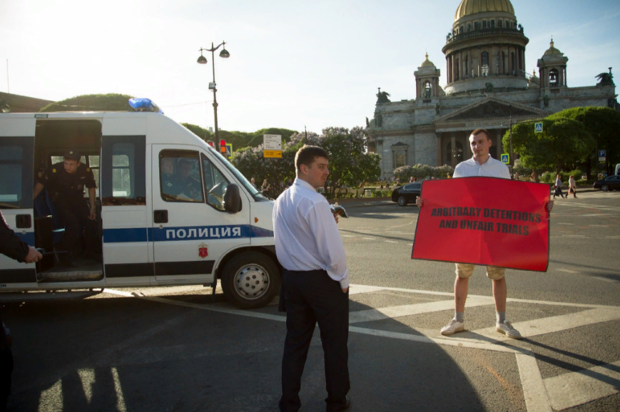 Полиция задержала Алексея Шигина, Юлию Макарову и Даниила Гороховского. Объясняя причину задержания, полицейские якобы сказали Гороховскому, что не знают английский язык и намерены перевести текст на плакатах в отделении, чтобы проверить его на экстремизм.