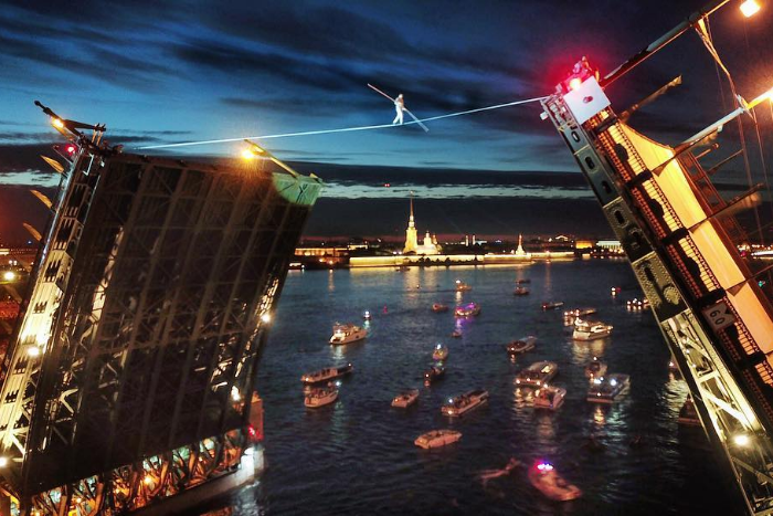 Петербургский канатоходец Расул Абакаров в ночь с 26 на 27 мая прошел по канату через разведенный Дворцовый мост. Трюк был заявлен как подарок ко Дню города. «РИА Новости» опубликовало видеозапись прохода Абакарова.