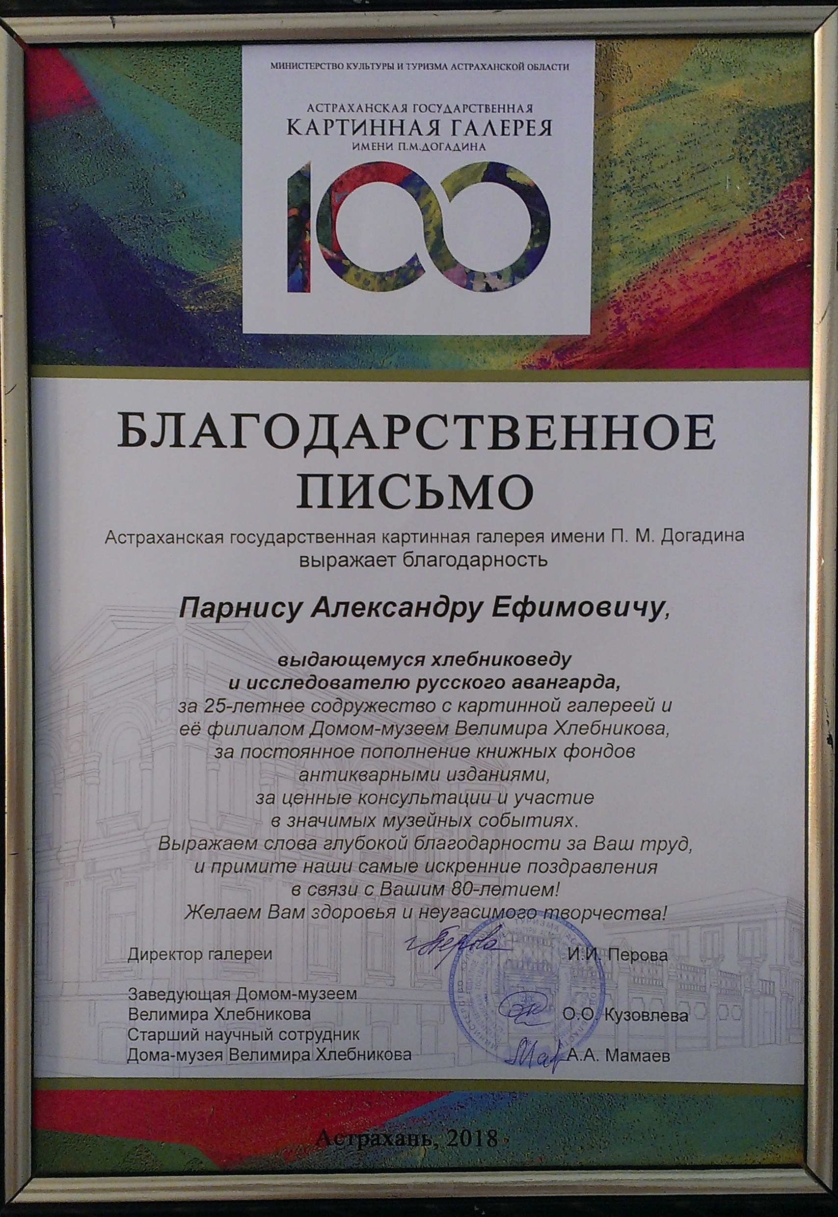 Александр Парнис: Я поставил себе такую странную задачу. Это было, с одной стороны, безумие, а, с другой стороны, полезно. Была такая сотрудница в бывшем Музее Маяковского на Таганке, Варвара Аветовна Арутчева, которая выступила с идеей создать словарь знакомых Маяковского. По тому же принципу я решил создать словарь друзей и знакомых Хлебникова. Поэтому я наводил справки о каждом человеке, который так или иначе мог с ним пересекаться. Тогда не было компьютеров, все это было безумно сложно, но мне многое удалось. Я, например, разыскал человека, который один раз случайно видел Хлебникова в поезде из Ростова в Баку, в купе они разговорились, на вокзале расстались, а вечером, придя в бакинское отделение РОСТа, он неожиданно снова его встретил, и больше никаких встреч с ним не было. Даже если человек жил за границей. Например, я искал людей, которые могли с Хлебниковым встречаться в Персии. А не так просто было найти в Москве через сорок лет, тем более из такой закрытой страны, как Иран. И мне кое-кого удалось найти, я был у посла Ирана в СССР.
