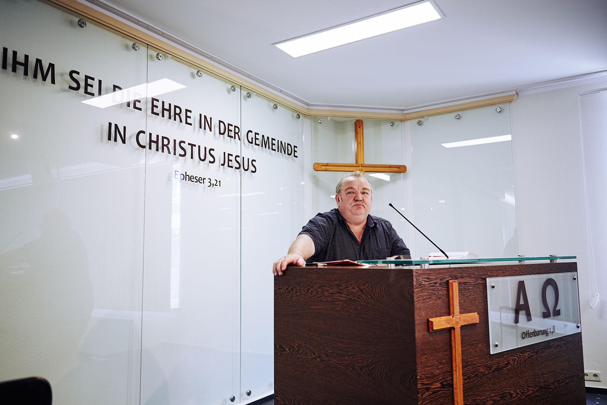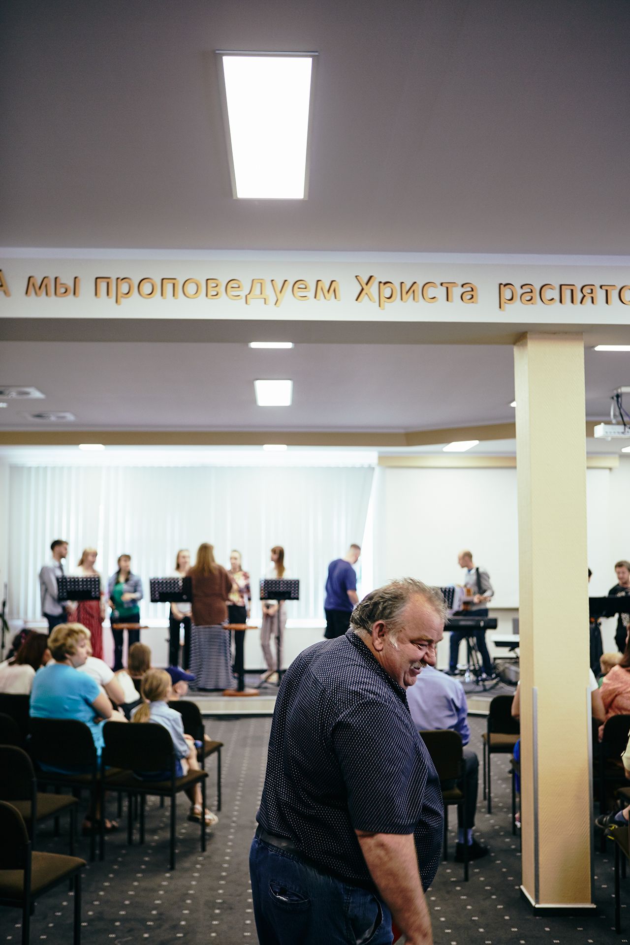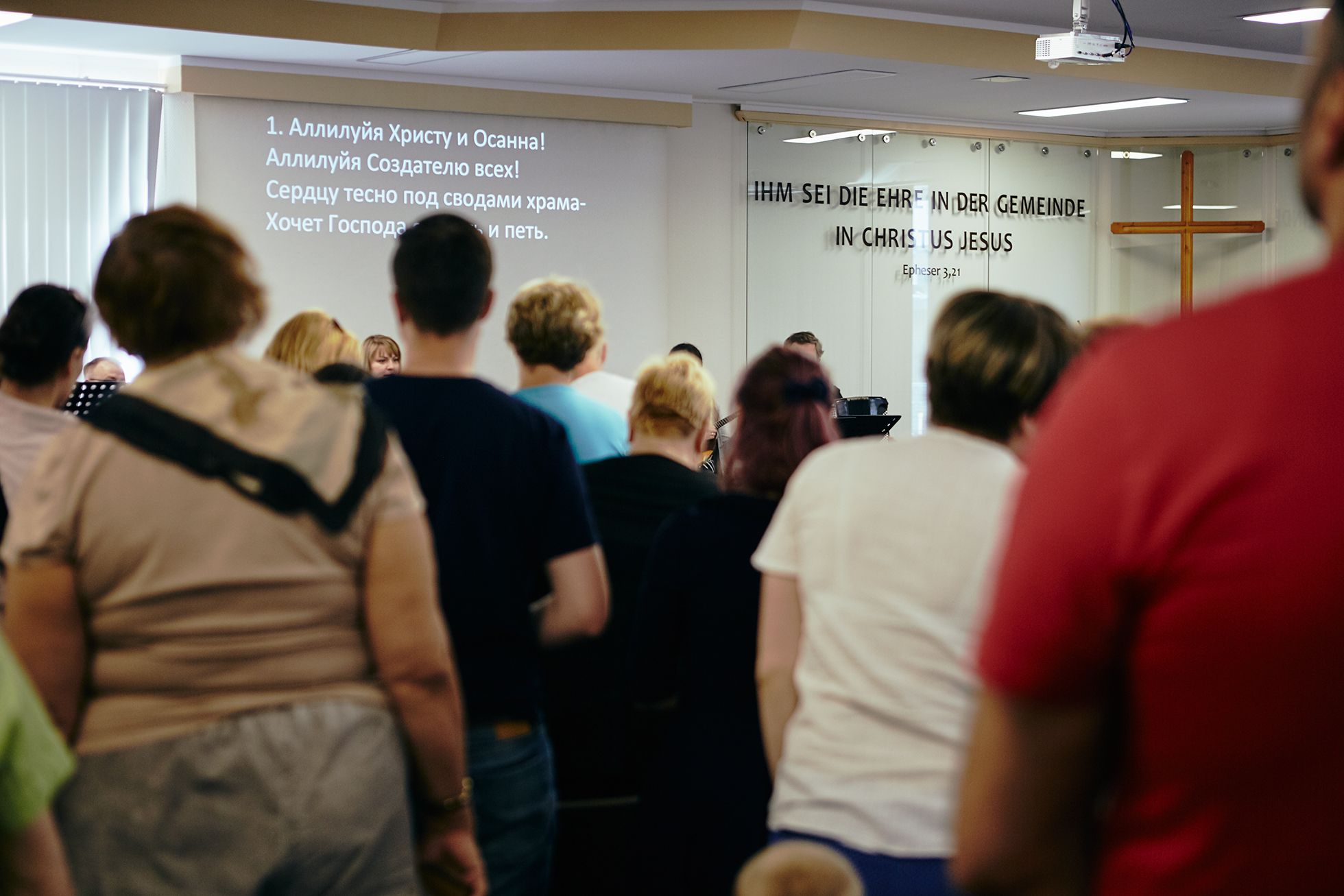 На воскресной службе в церкви, где Лихтенберг теперь служит, сидят несколько десятков человек всех возрастов — никто, включая подростков, не смотрит в телефоны. Священник читает с кафедры стихи из Евангелия, в перерывах на сцену выходит хор — солисты (в том числе дочери пастора) исполняют под аккомпанемент синтезатора песни, славящие Христа. И песни, и служба — на русском. В заключение, завершив причастие, Лихтенберг благодарит немецкое правительство, желает мира Иерусалиму и делает последнее организационное объявление: в конце мая в очередную годовщину работы церкви все желающие приглашаются на традиционный гриль.