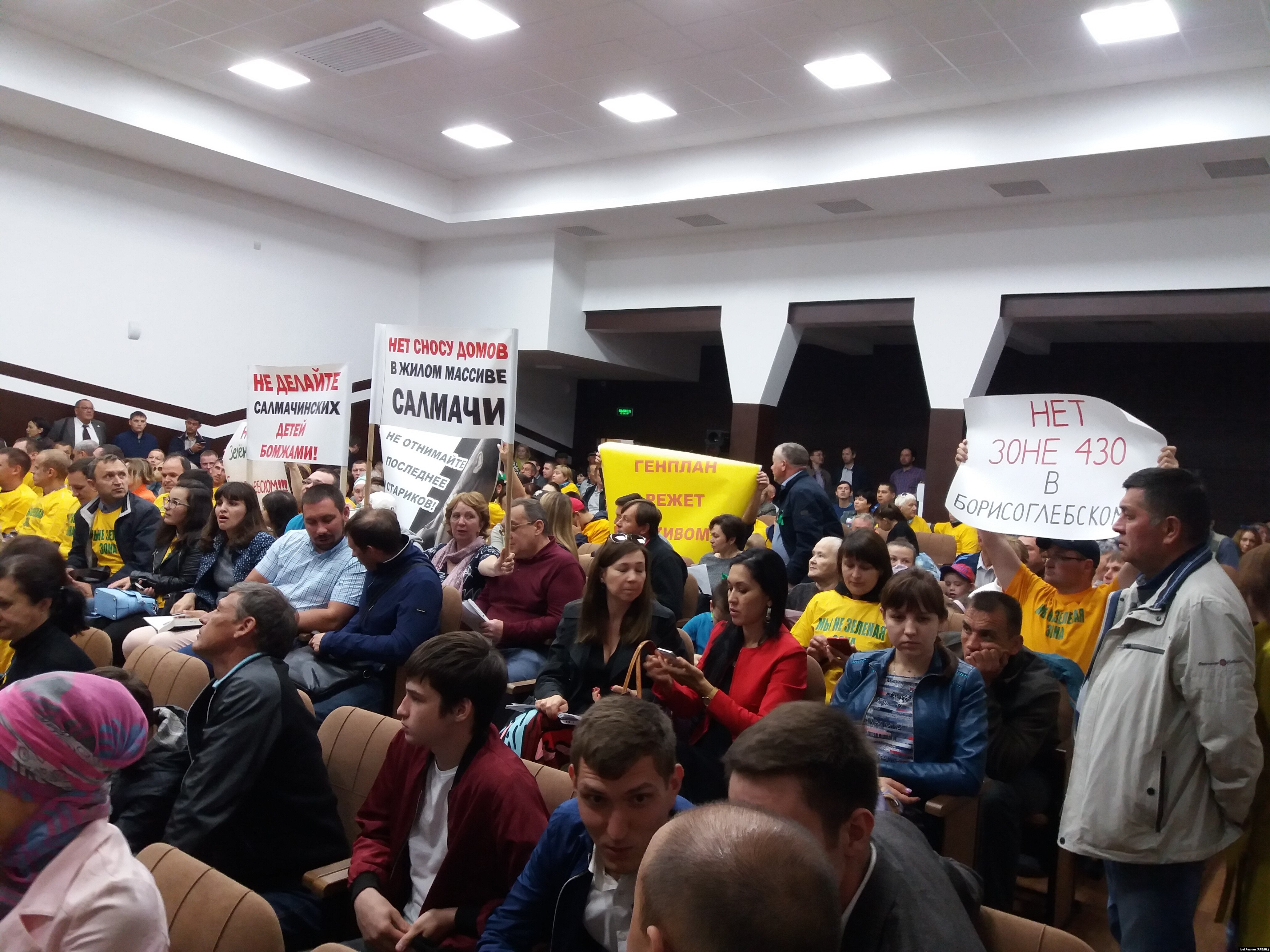 Новый генплан предусматривает развитие Казани до 2035 года. Его разработали в НИИ генплана Москвы. На обсуждение мэрия Казани отвела 6 дней. Первая встреча состоялась 29 мая в молодежном центре имени Аркадия Гайдара и шла без малого 5 часов. На эти слушания собрались несколько сотен человек. Много больше того количества, на которое рассчитан скромных размеров зал. Слушатели заняли все кресла, толпились в проходах. Многие развернули плакаты. Владельцы домов в Борисоглебском надели футболки с надписью "Мы не зеленая зона".
