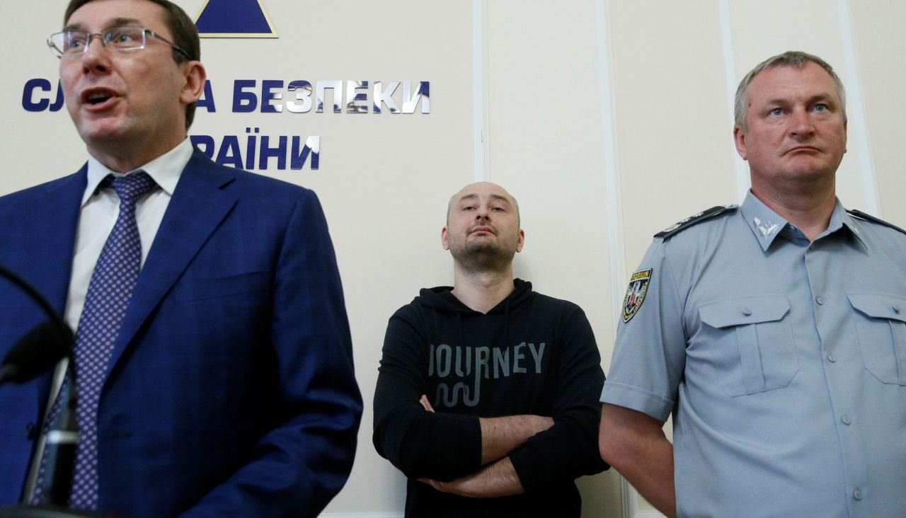 Valentyn Ogirenko / Reuters / Scanpix / LETA Генпрокурор Украины Юрий Луценко, журналист Аркадий Бабченко и глава полиции Украины Сергей Князев на пресс-конференции 30 мая