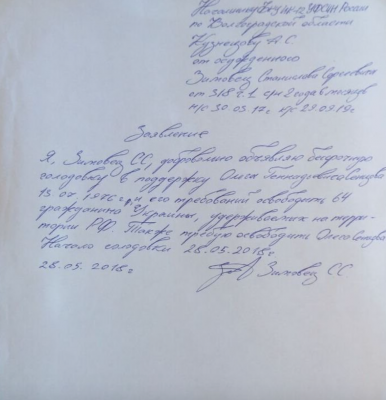 «Я, Зимовец СС, добровольно объявляю голодовку в поддержку Олега Геннадьевич Сенцова 13.07.1976 г. и его требований освободить 64 гражданина Украины, удерживаемых на территории РФ. Также требую освободить Олега Сенцова», — писал в заявлении осужденный.