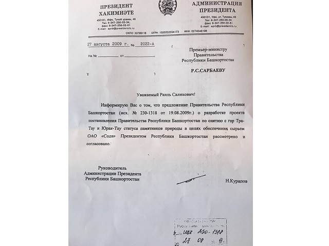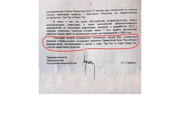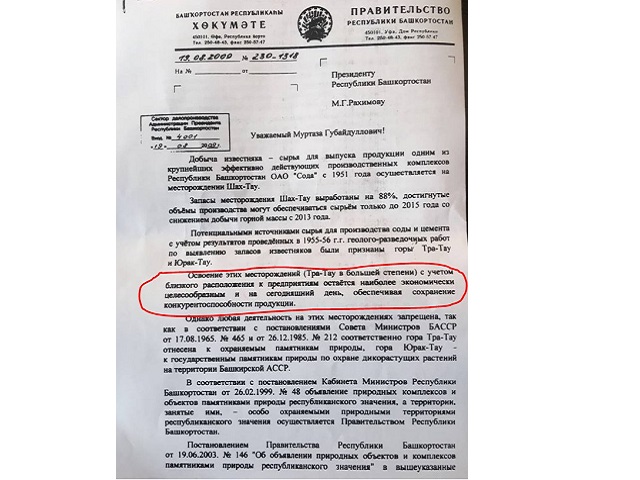 - Да. Существуют документы, письма. Бывший тогда премьером Раиль Сарбаев официально обратился к Рахимову с письмом, в котором предложил снять природоохранный статус и с Тратау, и с соседней горы Юрактау. Рахимов наложил резолюцию: "Согласовано".