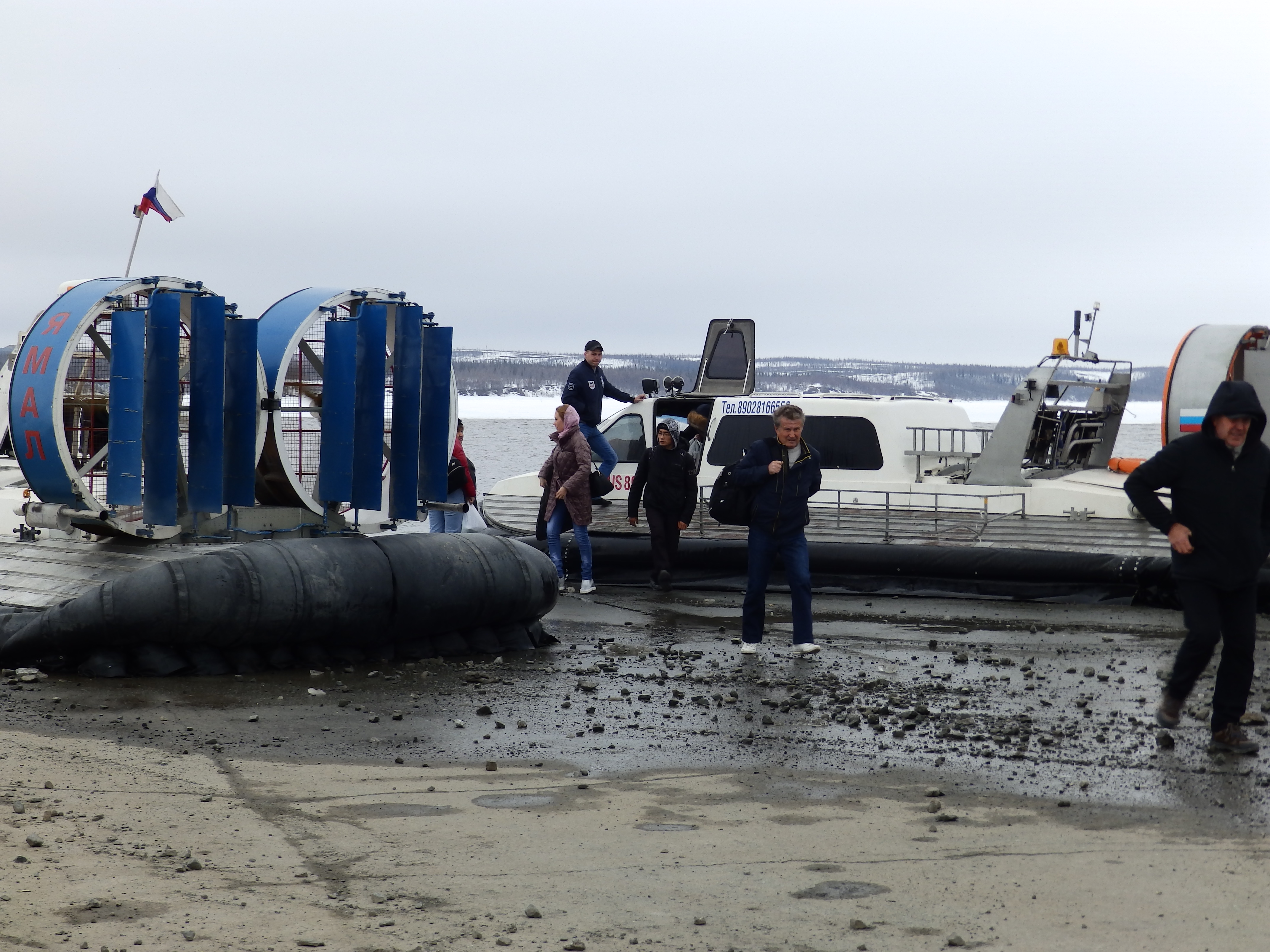 Моста через реку нет, а "зимник" (так называется автомобильная дорога, которую каждый год прокладывают по льду замерзшей Оби) уже закрылся. Поэтому приходится пересаживаться на вездеход на воздушной подушке.