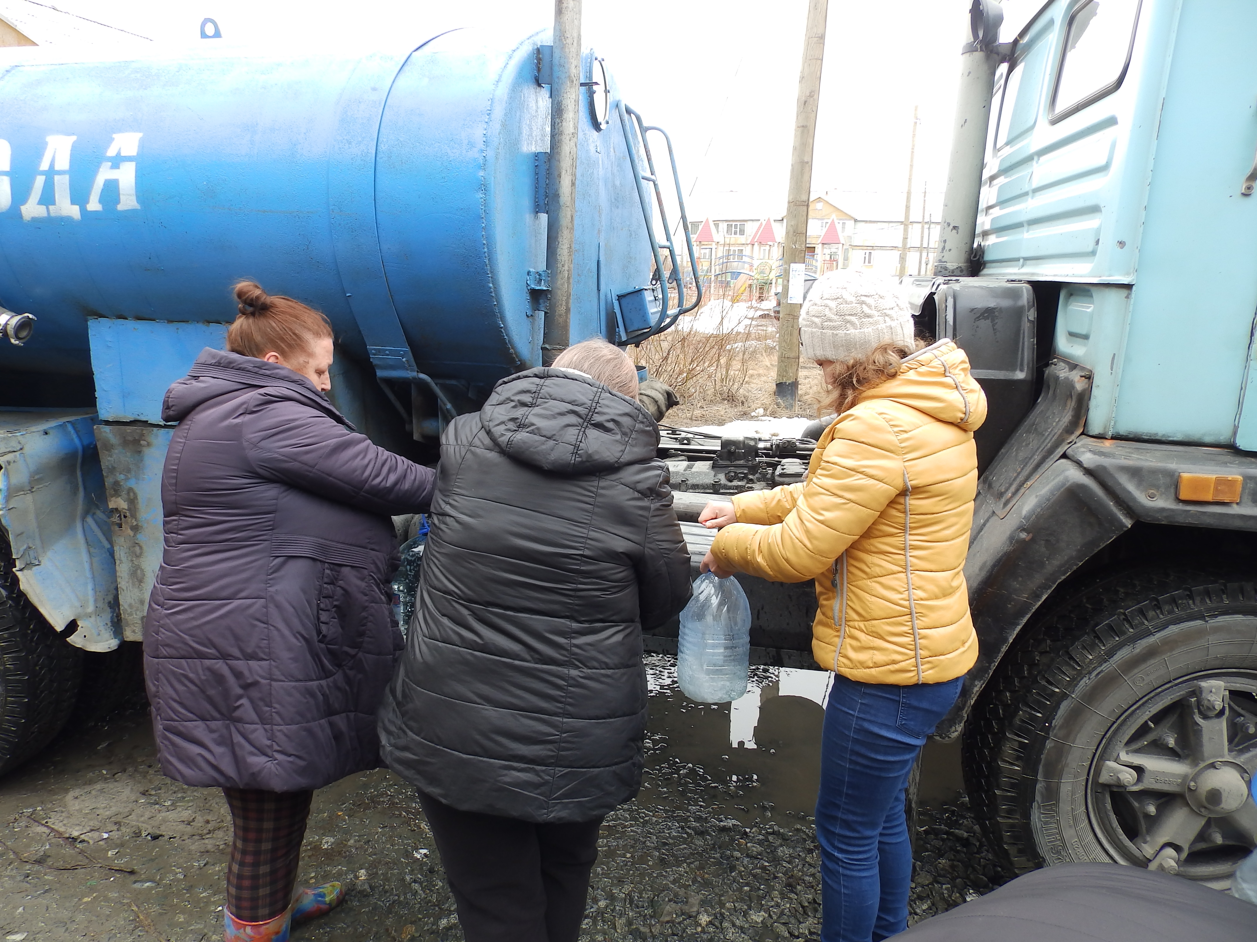 В эти дни тишину городских дворов периодически взрывают громкие автомобильные гудки. Это означает, что во двор приехала водовозка – машина с питьевой водой. Люди подходят к ней с бидонами и баклагами, и набирают для своих семей на несколько дней чистую питьевую воду.
