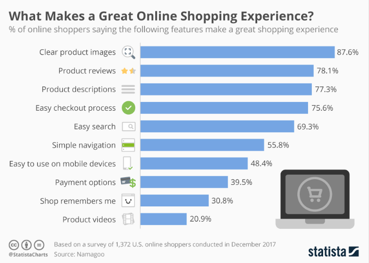 Больше всего любители онлайн-шоппинга ценят четкое изображение продукта — это самое важное для 87,6% покупателей, показал опрос в США. Далее идут рейтинг продукта (78,1%) и его описание (77,3%). Как ни странно, простота навигации по сайту и легкость в использовании сервиса на мобильных устройствах волнуют только половину опрошенных, а меньше всего пользователям нужны видео с демонстрацией продукта — это назвали самым важным только 20,9%.