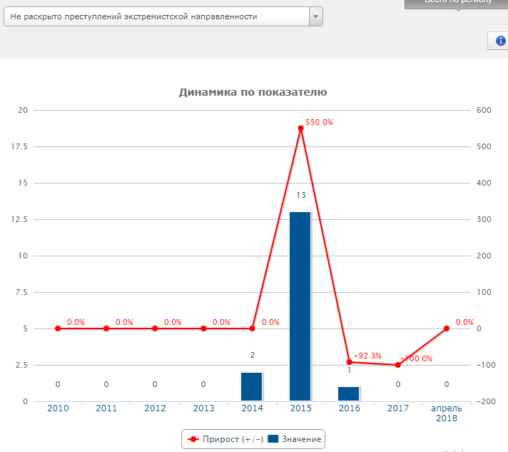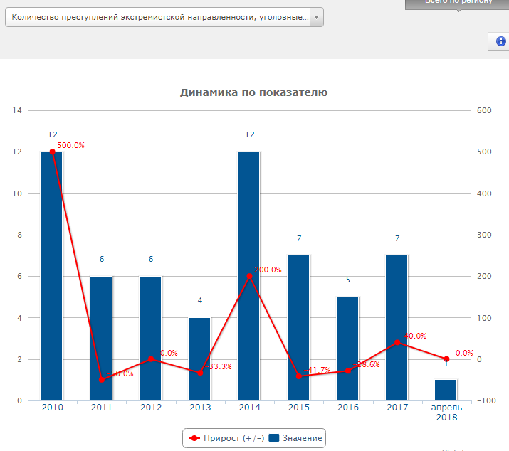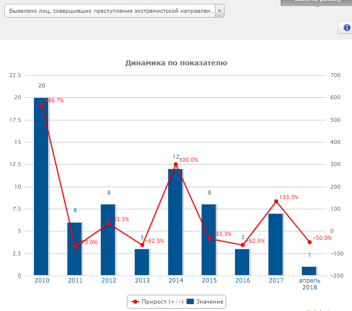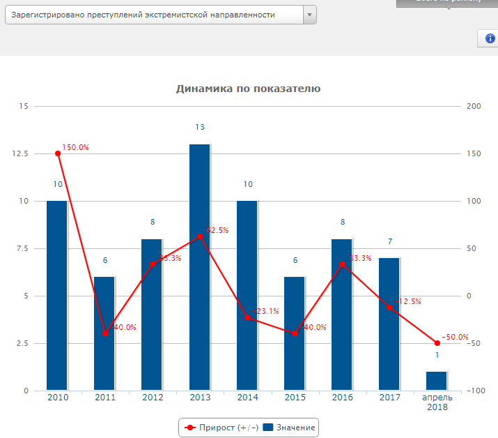 Экстремизм — семь преступлений за 2017 год и одно на конец апреля 2018 года. Ровно то же количество дел дошло до суда.
