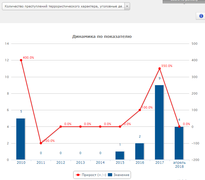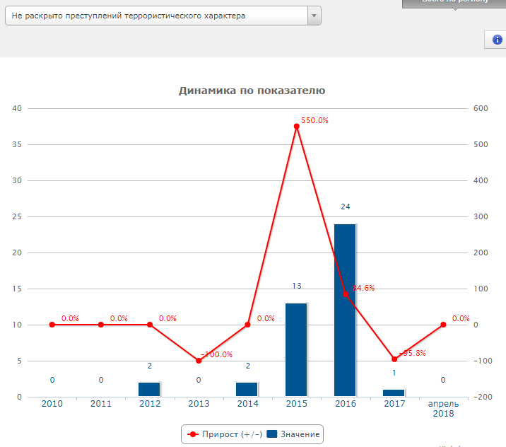 Оказывается, террористические и экстремистские преступления просто лучше всего раскрываются. По данным портала правовой статистики от Генпрокуратуры, только в 2017 году в Тюменской области (без учета автономных округов) было зарегистрировано 11 преступлений террористической направленности: от оправдания терроризма, за которое сидит тюменский блогер Алексей Кунгуров, до недоносительства. Девять дел доведены до суда. В январе-апреле этого года зарегистрировано шесть преступлений, четыре дошли до суда.