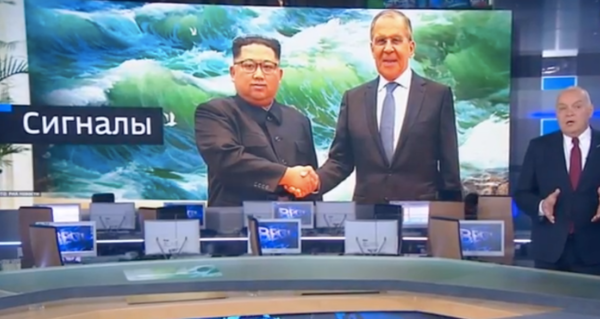 В новом выпуске «Вестей недели» на «России 1» показали сюжет о встрече главы МИД РФ Сергея Лаврова и лидера КНДР Ким Чен Ына. Пока Дмитрий Киселёв рассказывал детали (отрезок 1:14:40), сзади него появилось фото: на нём глава Северной Кореи улыбается, пожимая руку Лаврову. Однако на оригинальной фотографии, опубликованной МИДом 31 мая, на лице северокорейского лидера улыбки нет.