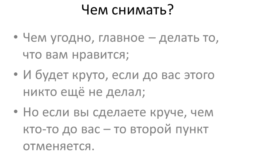 Снимать видео можно чем угодно, главное – делать то, что вам нравится.
