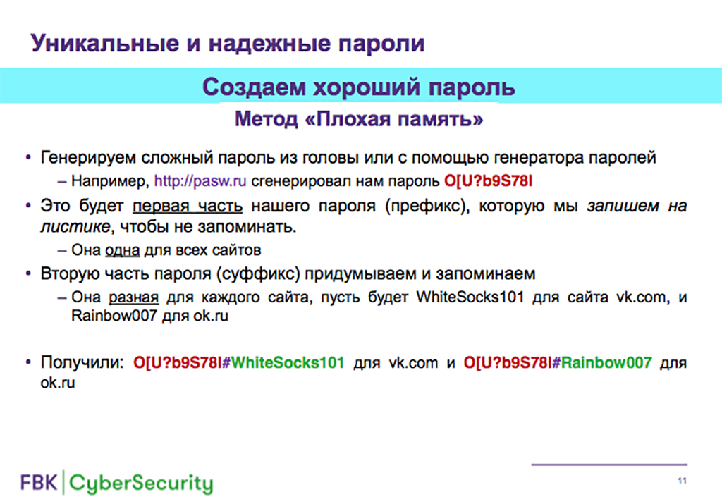 «Простой пароль легко запомнить и легко подобрать для взлома. Хороший пароль легко запомнить и сложно подобрать для взлома. Хороший пароль должен состоять из пяти случайных слов из разных тематик без привязки к вашей личности (дата рождения, кличка собаки)». Сергей Мигалин