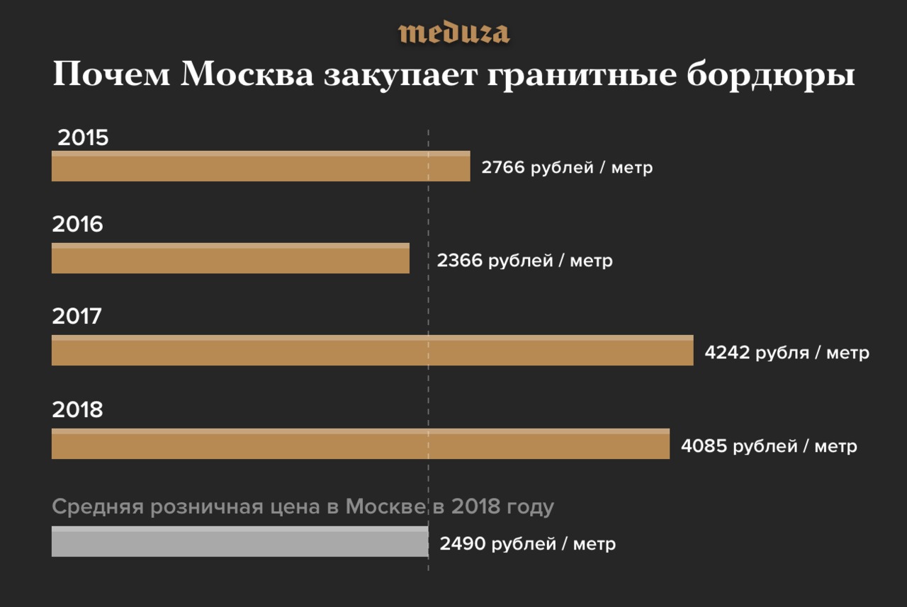 В Москве опять — четвертый год подряд — меняют бордюры. 31 мая власти объявили два тендера на закупку 272 километров гранитных бордюров на сумму 1 миллиард 110 миллионов рублей. Как выясняется, город платит за эти бордюры намного больше их рыночной стоимости, причем цена меняется каждый год. Если в 2016 году она составляла 2366 рублей за погонный метр, то в 2017-м — уже 4242 рубля, а в этом году незначительно снизилась. Зарабатывают на этих бордюрах компании, близкие к чиновникам мэрии.