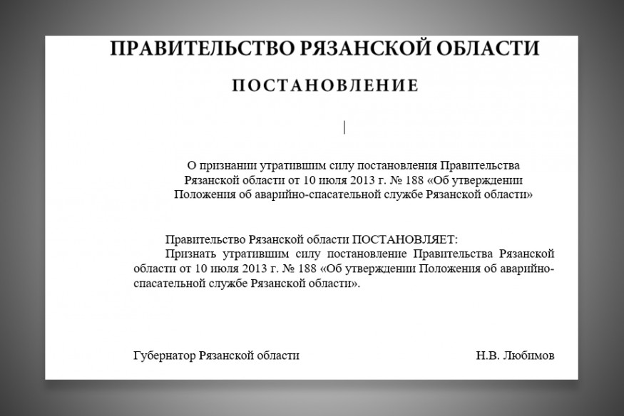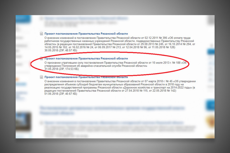 31 мая 2018 года на сайте правительства Рязанской области появился проект постановления о признании утратившим силу постановления регионального правительства от 10 июля 2013 года №188 «Об утверждении Положения об аварийно-спасательной службе Рязанской области».