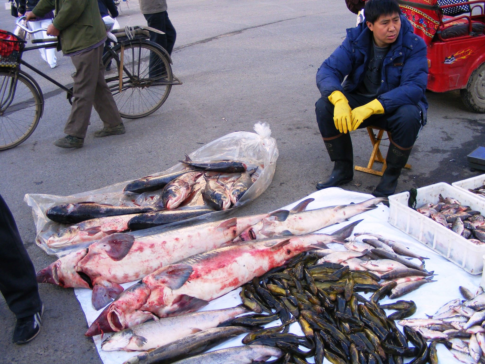 Китайские друзья, позвольте объясниться, ведь эта вымирающая порода осетровых, живущая только в Амуре, внесена в Международную красную книгу и в Красную книгу России. За отлов такой особи русскому рыбаку по законам России пришлось бы заплатить огромный штраф или даже лишиться свободы на несколько лет. Оказывается, в КНР лов амурских осетров разрешен по государственной лицензии. На том самом уличном рыбном рынке в Хэйхэ всегда можно увидеть только что пойманных калуг.
