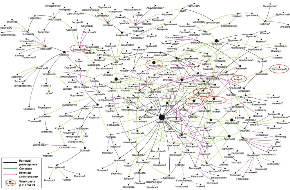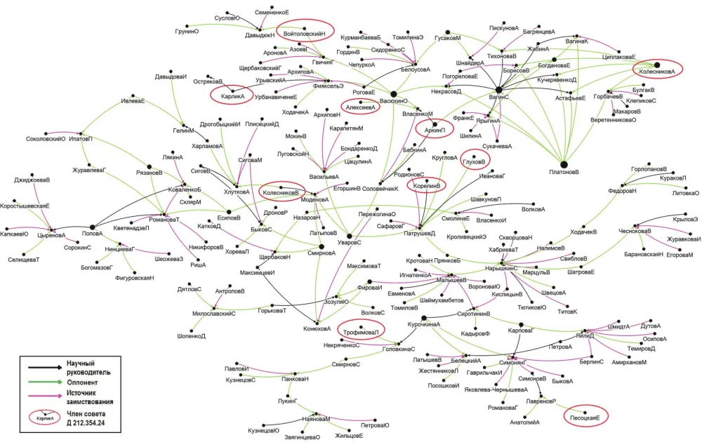 Ярким случаем такого возрождения стал совет при Санкт-Петербургском экономическом университете Д 212.354.24 по научной специальности 08.00.05 (экономические науки) [1]. Совет был создан 26 апреля 2018 года и состоит в основном из членов бывших диссертационных советов по экономике Санкт-Петербургского государственного инженерно-экономического университета (ИНЖЭКОН) и Санкт-Петербургского университета экономики и финансов (ФИНЭК). Только по экономике в советах этих вузов было защищено более 140 диссертаций с массовыми некорректными заимствованиями.