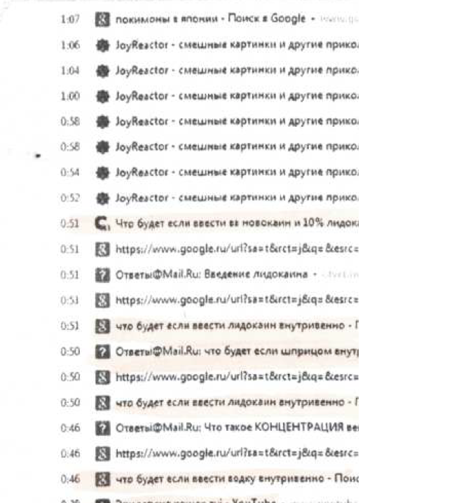 Последние четыре часа в истории браузера — вплоть до того, как компьютер включит Александр — сидевший за ним человек изучал риски, связанные с анастетиком: «Смертельная доза лидокаина», «Передозировка лидокаина», «Бытовые яды», «Апноэ», «Правильный укол в вену», «Тонико-клонические припадки», «Что будет, если ввести лидокаин внутривенно». Последний запрос — фильм «Явись, Азазель».