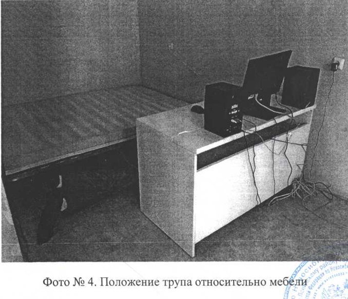 Пока Татьяна сдавала в гостиницу для животных найденного Сашей на улице пса Рекса и мчалась в расположенный 300 километрах от Усть-Илимска аэропорт Братска, в Новосибирске на квартиру, где проживали ее сыновья, пришли по вызову двое полицейских — Муллахметов и участковый Еремеев. Тело Леонида они обнаружили лежащим лицом вниз в узком, примерно метр в ширину, проходе между компьютерным столиком и разложенным диваном, на котором валялось скомканное белье, осенняя куртка и пустая сумка. На шее болтались наушники, подключенные к системному блоку, комната была заставлена коробками из-под пиццы, лапши быстрого приготовления и спреев от насморка.