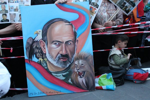 Портрет Пашиняна, нарисованный его сторонницей. Митинг в Ереване 30 апреля / Фото: Гор Алексанян