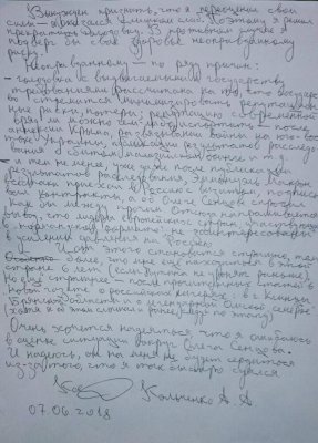 В письме Кольченко отмечает, что «переоценил свои силы». Кроме того, он считает, что продолжение голодовки не освободило бы Олега Сенцова, так как российские и иностранные власти не заинтересованы в этом.