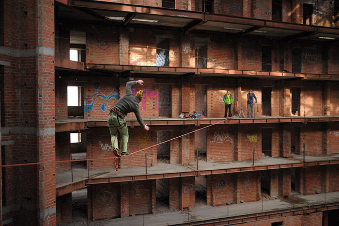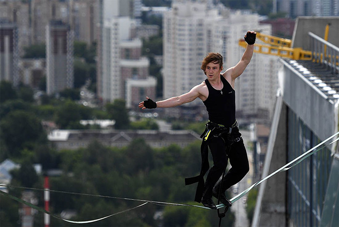 На мой взгляд, каналы — это всё равно не самое запоминающееся, что бывает в слэклайне. Например, в прошлом году в Екатеринбурге я выступал между двумя 37-этажными зданиями. С такой высоты открывается прекрасный вид. Это в целом очень волнительно и местами страшно, несмотря на двойную страховку.