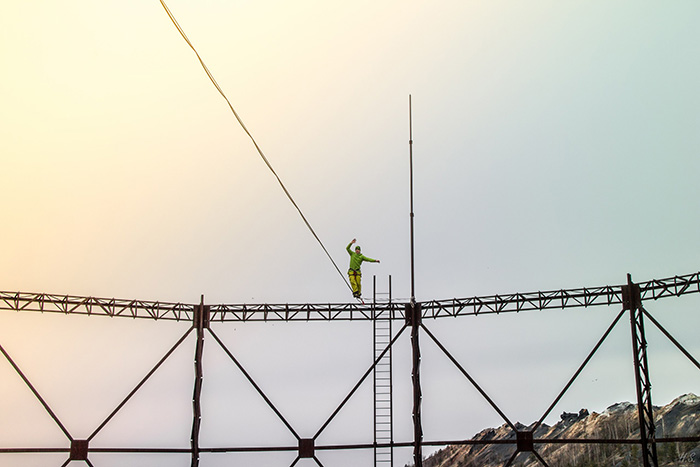 Два года назад я ходил по 60-метровой стропе в Галиче на вышке высотой 350 метров. Мы «тянулись» три дня: это было сложный проект как в подготовке, так и в выполнении. Но мы это сделали и оказались первыми в мире — до нас никто такого не делал.