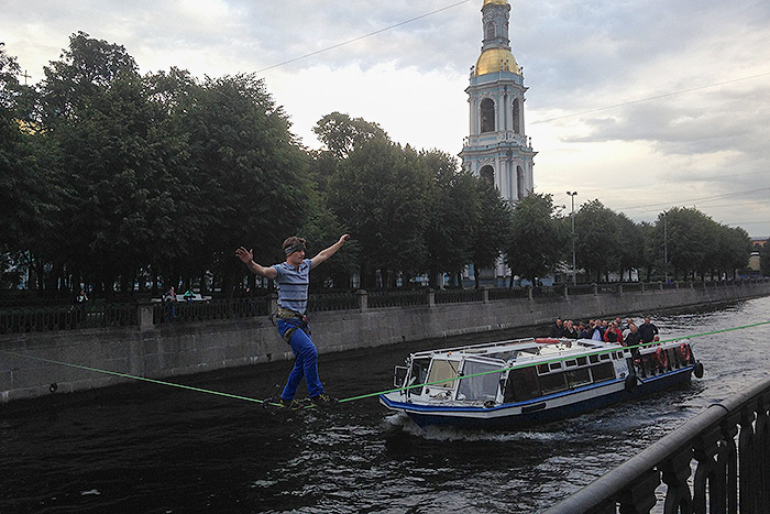 В начале июня два молодых человека ночью перешли по специальной стропе через Крюков канал. Они оказались слэклайнерами — спортсменами, которые ходят между двумя объектами по свободно закрепленной веревке. В Петербурге они обычно тренируются в парках и заброшенных зданиях.