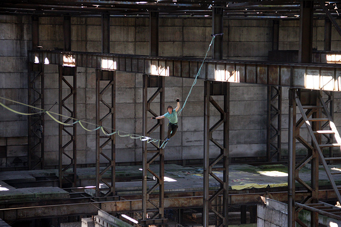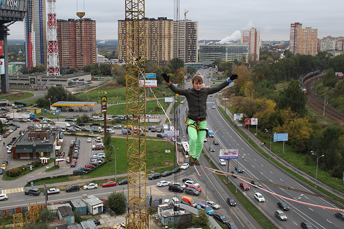 — Я уже пять лет занимаюсь слэклайном — хождением по натянутой между двумя объектами свободно закрепленной веревке. Два года назад я специально приехал сюда из Екатеринбургa, чтобы продолжить занятия здесь. Для меня это любимое дело: и будоражит, и дает посмотреть на вид с другого угла.