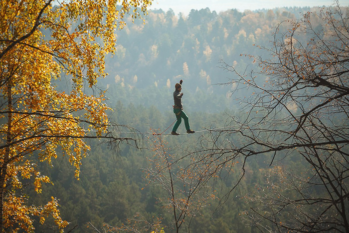 Мы ходим по провисающей веревке — стропе, выполняем трюки. Слэклайн путают с хождением по канату, но у канатоходцев трос натянут неподвижно, они идут с балансером, там главное — равновесие. А мы подводим стропу, которая больше похожа на веревку, нежели на канат, под свой центр тяжести.