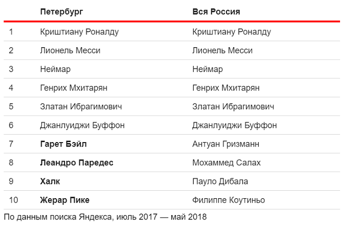 «Яндекс» составил список самых популярных в Петербурге футболистов