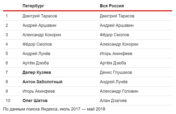 Аналитики «Яндекса» составили список самых популярных российских футболистов в Петербурге и по всей стране. Оба рейтинга возглавил игрок московского «Локомотива» и бывший муж Ольги Бузовой Дмитрий Тарасов.
