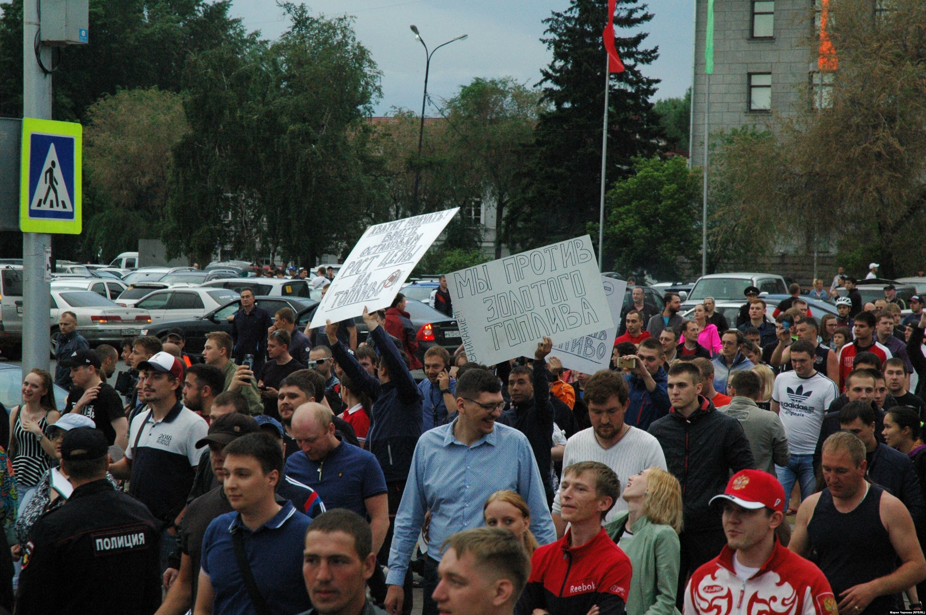 Люди с рукописными плакатами "Хватит молчать! Вместе остановим рост цен на топливо" и "Мы против золотого топлива" сначала собрались возле здания областного правительства, а когда парковка перестала вмещать всех собравшихся – перешли через дорогу в сквер. По словам участников, народу было бы больше, если бы у въезда в центр города инспекция не остановила нескольких дальнобойщиков, ехавших на митинг. В сквере было около десятка полицейских, но обошлось без задержаний, хотя участники "народной акции", возмутившись плакатами с политическими лозунгами и логотипами партий, порвали несколько баннеров.
