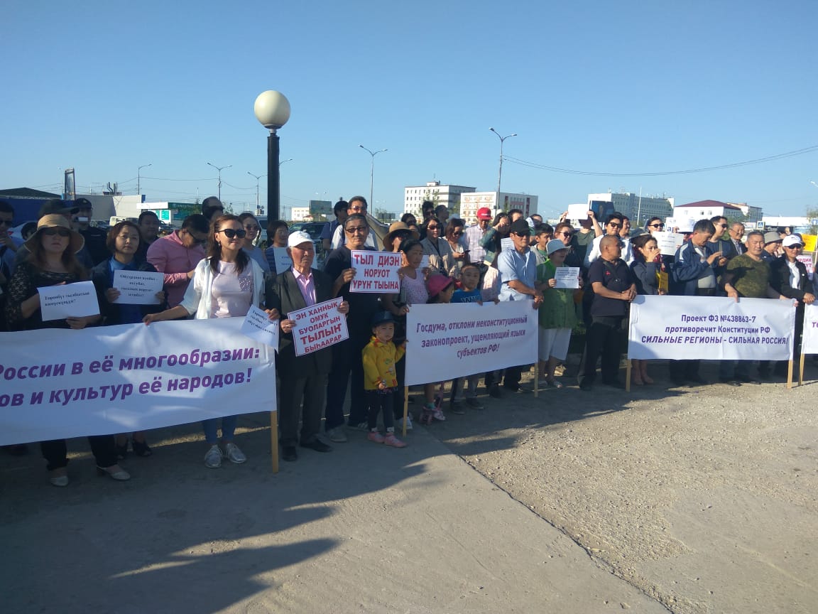 7 июня на окраине Якутска состоялся митинг, в котором приняли участие около 150 человек. Они потребовали от федеральных и республиканских властей отказаться от поправок в федеральный закон "Об образовании", которые, по мнению организаторов, значительно уменьшат объемы преподавания якутского языка в школах.