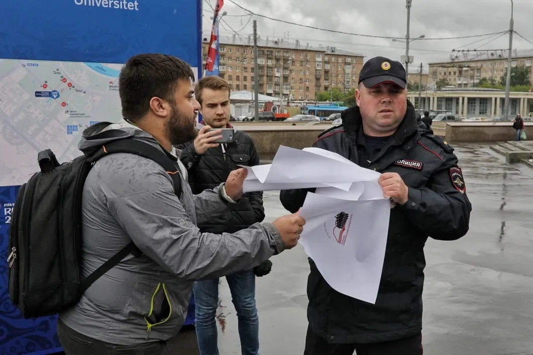 Возле метро «Университет» задержали сопредседателя профсоюза «Университетская солидарность» Андроника Арутюнова, который вышел с одиночным пикетом в поддержку первокурсника филологического факультета МГУ Дмитрия Петелина. По версии правоохранителей, студент написал на указателе «Нет фан-зоне».