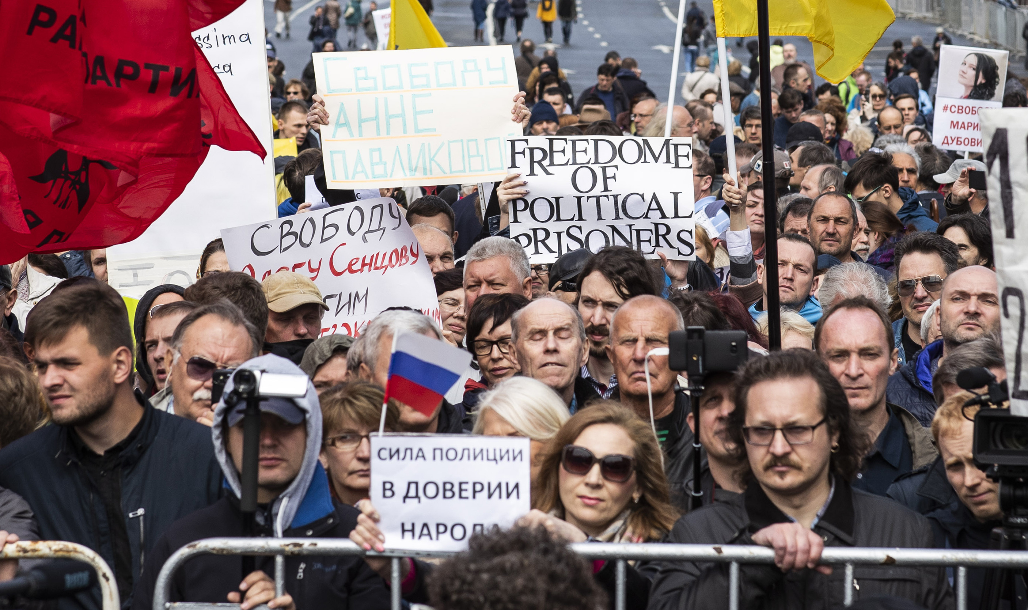 Участники митинга "За свободную Россию без репрессий и произвола", выступили за освобождение держащего голодовку в российской колонии украинского режиссера Олега Сенцова и других политзаключенных, в частности, антифа-активистов и сторонников Вячеслава Мальцева.