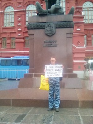 По словам Полюдовой, Котов стоял в одиночном пикете у памятника маршалу Жукову с плакатом, на котором было написано: «В День России требуем свободу. Революция будет. ЧМ ФИФА — бойкот».