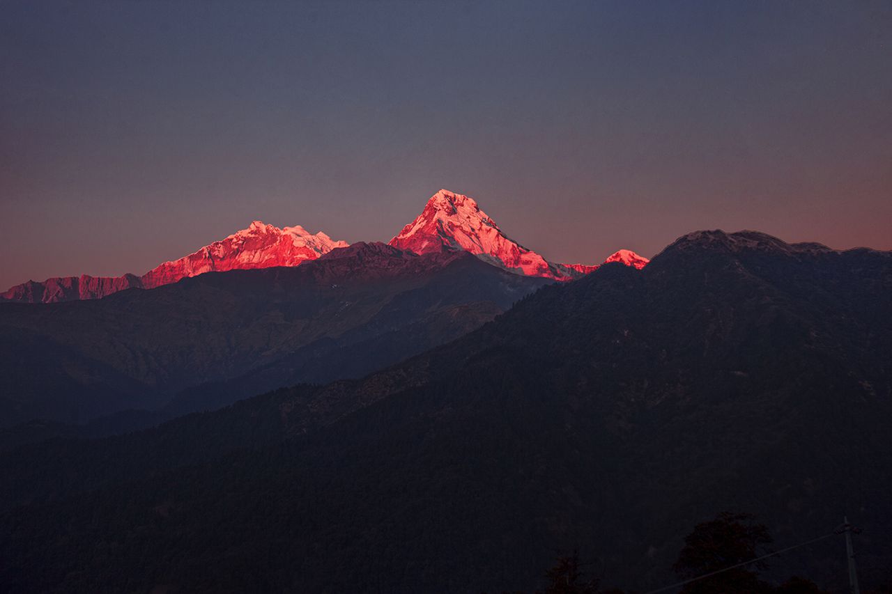 Бытует мнение, что поход в Гималаи зимой — это кромешный мороз, снежная слепота, мокрые ноги и стопроцентная вероятность заболеть. Снимки путешественников, на которых они в горнолыжных куртках, с трекинговыми ботинками и палками улыбаются и ни минуты не мёрзнут, — повод для паники у того, кто подобной экипировкой не обзавёлся. Единственное, что я успела сделать, так это купить пуховик в Киеве и обнаружить, что он холодный даже для украинской зимы. Поэтому второй я приобрела за час до вылета. Рубеж года в Гималаях предвещал незабываемый опыт криозаморозки. Опытные странники выбирают пеший поход вокруг Аннапурны до базового лагеря АВС (4130 метров), но наша вершина ознаменовалась Пун Хиллом (3210 метров). Головокружительный вид. Мы на вершине мира. Гималаи увязли в пунцовом молчании заката. Так, непоколебимо на протяжении долгих эонов и веков, они стоят на страже сущего и наблюдают за цикличным фарсом жизни. Пелена облака вокруг закрытой от восхождений горы Шивы — Мачапупаре (6998 метров) безостановочно сгущалась и ускользала. Согласно поверьям, это не что иное, как дым его божественной сущности.