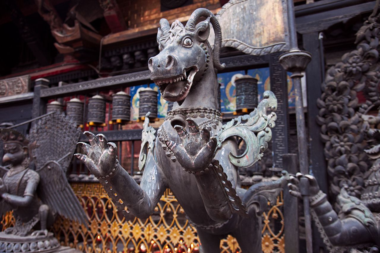 Ходьба по Тамелю, историческому центру Катманду, метр за метром приводит к грибнице храмов: с индуистских рычат божества, капая кровью из глазных орбит, буддийские — само спокойствие, полусферический сосуд блага. Восемьдесят пять процентов непальцев всё-таки индуисты, приверженцы той самой «вечной религии», которые возвели изваяния десятков святых и поставили их на страже собственной жизни, ежедневно засыпая их цветами да пряностями. В быту индуизм порой доходит до абсурда, когда в кафе на выпавший из тарелки рис официант смотрит и спрашивает: «Это подношение божеству?». Из тримурти (триады) — создателя Брахмы, хранителя Вишну и разрушителя Шивы — больше всего здесь жалуют последнего, добавляя величественную приставку «лорд». Изображают его длинноволосым синим мужчиной, с трезубцем в руке и змеями на шее. Потому, если после прочтения моего опуса ты прибудешь в Непал, то можешь быть уверен, что трезубец с фасадов зданий на местных улицах — его символ, мечевидное орудие на страже льда и ада. Только помни, что при пересечении самолётом десятков меридианов, разбивается лутрофор обыденного времени: по местному календарю Викрам-Cамват в Непале сейчас 2074 год.