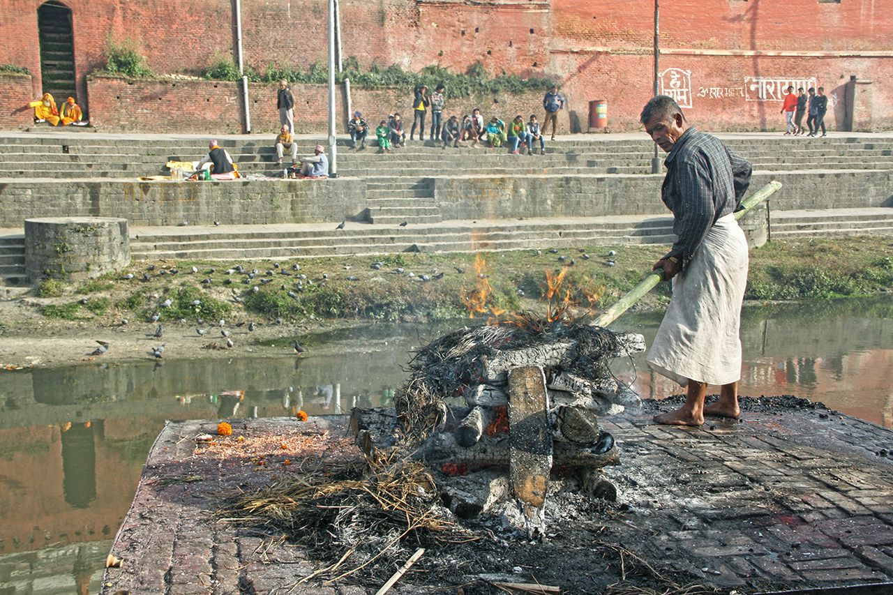 Индуисты предпочитают хаос, потому как без него не было бы равновесия. Зеркально и в стране: уличный балаган, пыль, коровы, еда, тук-туки — всё вращается в благосклонном вареве дхармы, но до чего филигранный танец жизни выходит в итоге. Оканчивается он для представителей нашего биологического вида в священной реке Багмати, на берегу которой главный храм Шивы — Пашупатинатх. Вера в доктрину, что материя тела состоит из пяти первоэлементов (огонь, воздух, вода, эфир, земля), движет людей по истечении века вернуть взятое обратно в универсум путём кремации. Мы наблюдали, как оплакивают труп, укутанный в яркие ткани, посыпая его цветами и поливая горсточкой водицы. Вскоре он горел. Запах жареной плоти не доносился, но картина, как босой работник подбрасывает пламя и переворачивает головешкой полусожжённые остатки, весьма занимательна. Работа не бог весть какая, а заработок в месяц — 100 долларов, причём даже для Непала эта сумма — пшик.