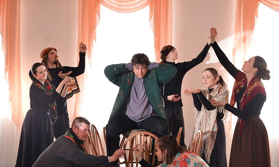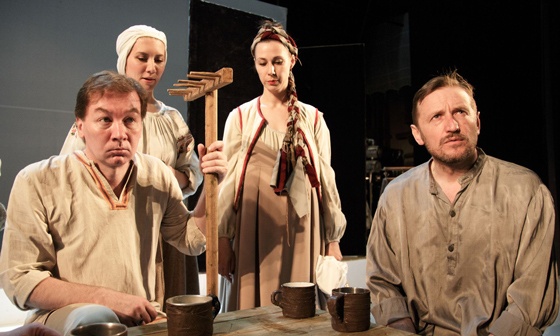 Сцена из эскиза по пьесе «Первый винокур, или как чертенок краюшку заслужил», Калужский драматический театр — Как меняется роль документалистики в условиях торжества сегодняшнего абсурда? В ситуации постправды со сверхъестественным «воскрешением» Аркадия Бабченко и фантасмагорическими судами, в ситуации постоянной информационной войны, множащей недоверие, как трансформируется поиск правды на территории документальных кино и театра?