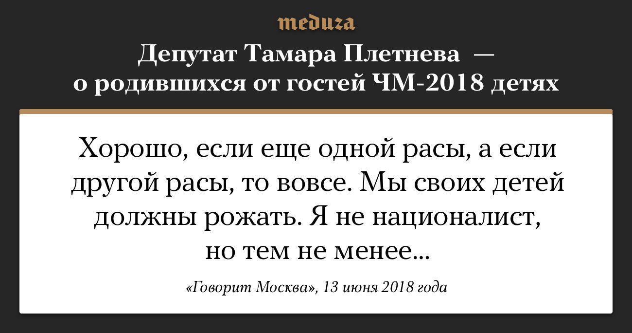 - Глава комитета Думы по вопросам семьи, женщин и детей Тамара Плетнева заявила, что российским женщинам не следует во время ЧМ вступать в связь с болельщиками, приезжающими из других стран.