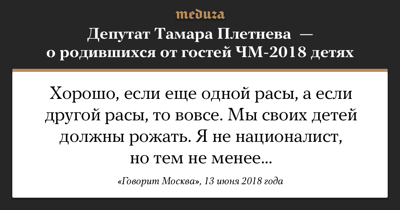 Россия с 14 июня по 15 июля будет принимать чемпионат мира по футболу. На него, как ожидается, приедет около одного миллиона болельщиков. Глава комитета Госдумы по вопросам семьи, женщин и детей Тамара Плетнева заявила, что российским женщинам не следовало бы вступать в связь с гостями ЧМ, так как после этого могут родиться дети.