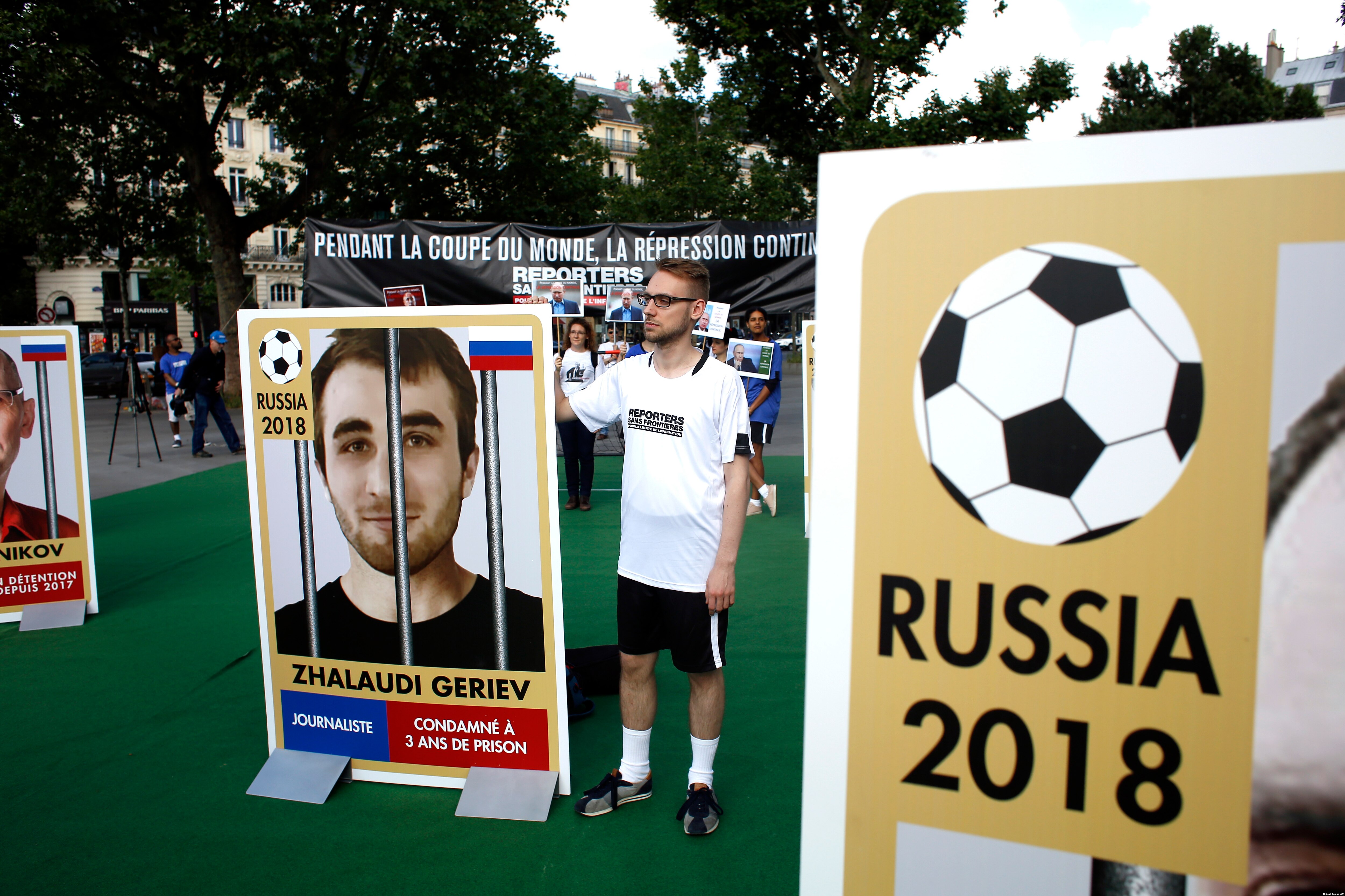"Репортеры без границ" начали кампанию по привлечению внимания к проблеме преследования журналистов и ограничения свободы СМИ в России. В преддверии чемпионата мира по футболу организация создала в Париже инсталляцию в виде футбольного поля с фотографиями семи журналистов, которые арестованы или отбывают наказание в российских колониях.