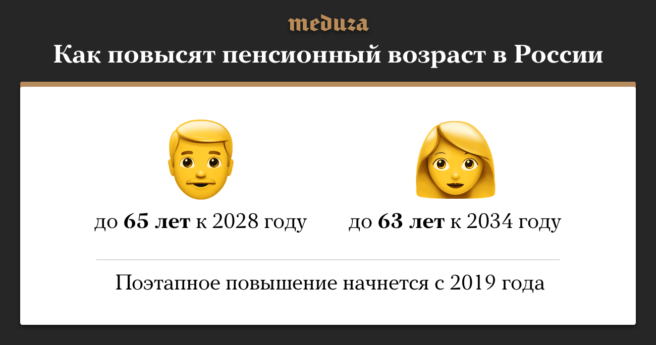 Премьер-министр РФ Дмитрий Медведев объявил, как в России планируется повышать пенсионный возраст. Повышение возраста выхода на пенсию будут проводить поэтапно и начнут в 2019 году. Сейчас в России женщины могут выйти на пенсию в 55 лет, а мужчины — в 60 лет.