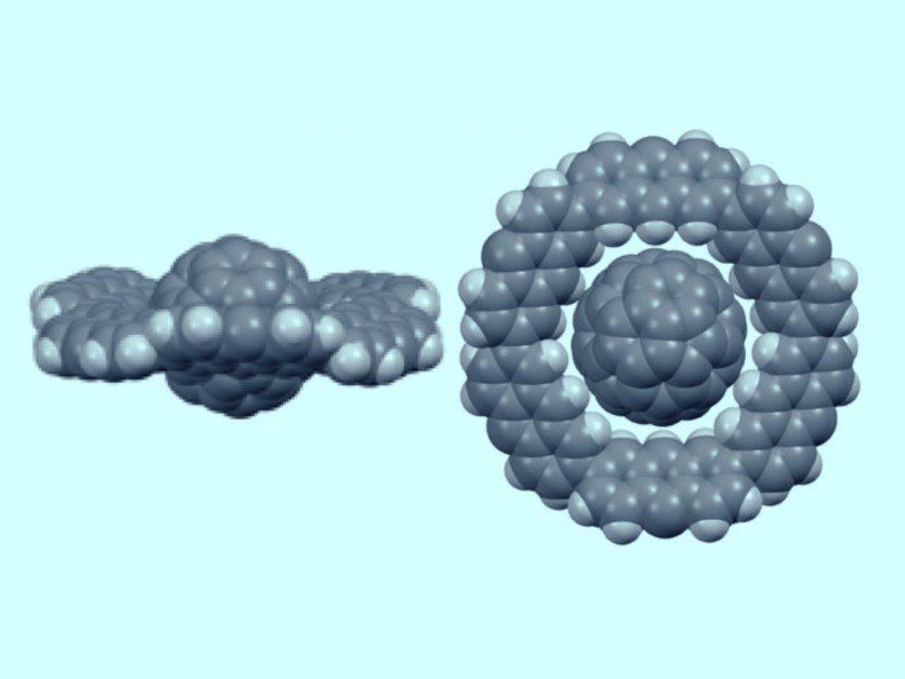 За счет электронных связей химики научились соединять сферы фуллеренов с макроциклами – различными крупными молекулами, содержащими в себе кольца из атомов, получая конструкции разной формы. Но ранее никто не объединял фуллерен с плоским кольцом. Это удалось сделать, собрав «планетные кольца» из антрацена, каждая молекула которого состоит из трех соединенных бензольных колец. Внутрь общего кольца, в сторону фуллерена, оказались обращены восемнадцать атомов водорода из состава антраценов. Слабого притяжения между пи-орбиталями электронов фуллерена и этими атомами хватило, чтобы стабилизировать «нано-Сатурн».